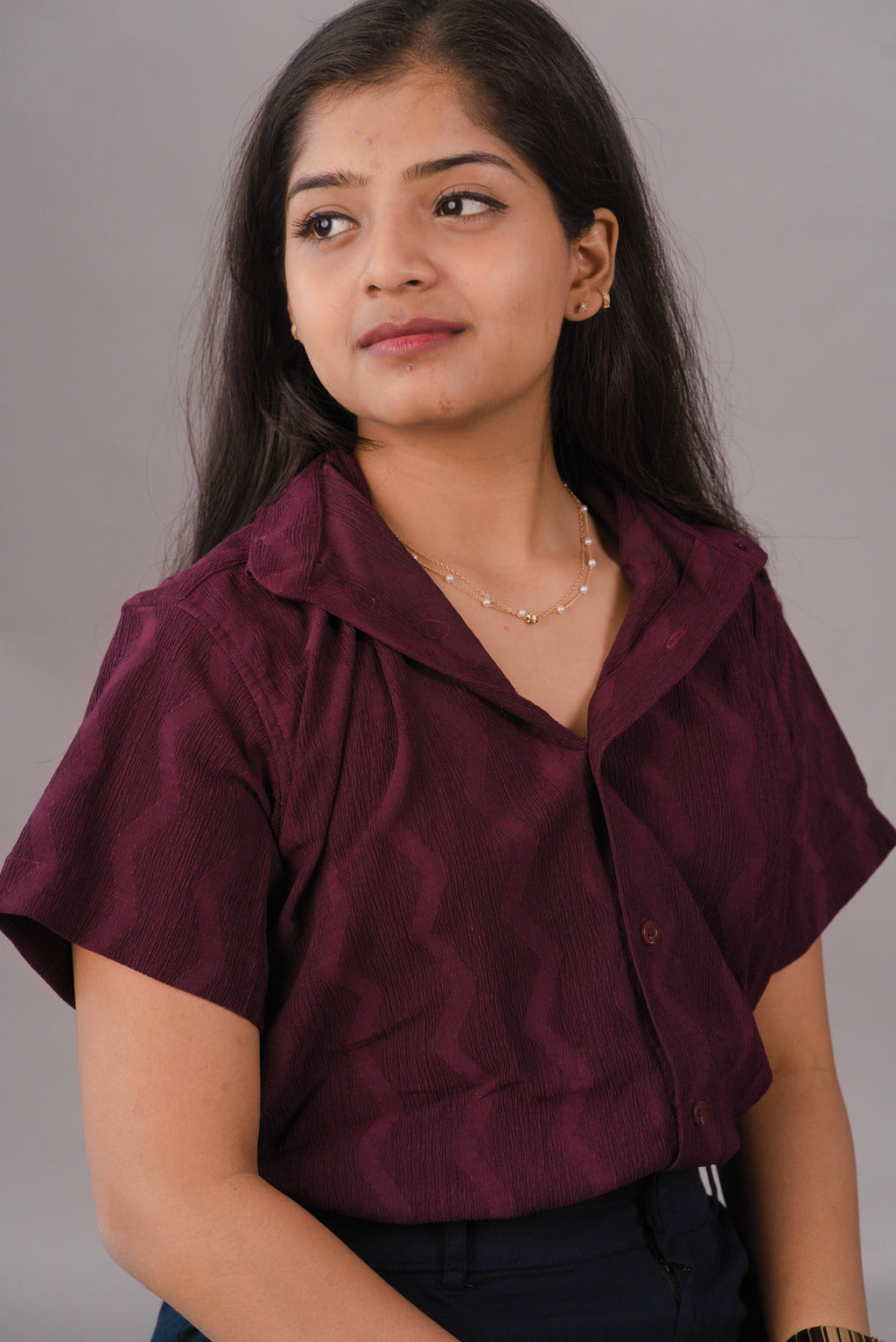 Add timeless richness to your wardrobe with our Deep Burgundy Wine Self-Textured Premium Women’s Shirt, crafted from a premium cotton-polyester imported blend that combines softness with long-lasting durability.