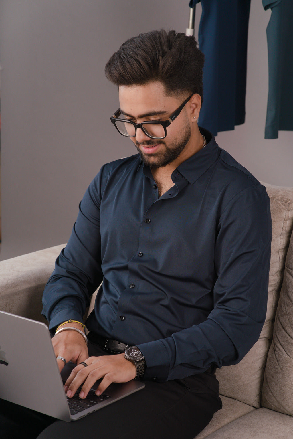 Elevate your executive presence with the Deep Navy blue Men’s Smart Tech Shirt by Dare & Rise. This classic, commanding blue is engineered using advanced stitch-less technology, replacing traditional sewn seams with high-strength, precision-bonded construction. This innovative design eliminates the bulk and friction of internal threads, resulting in a razor-sharp, aerodynamic silhouette that feels like a second skin.