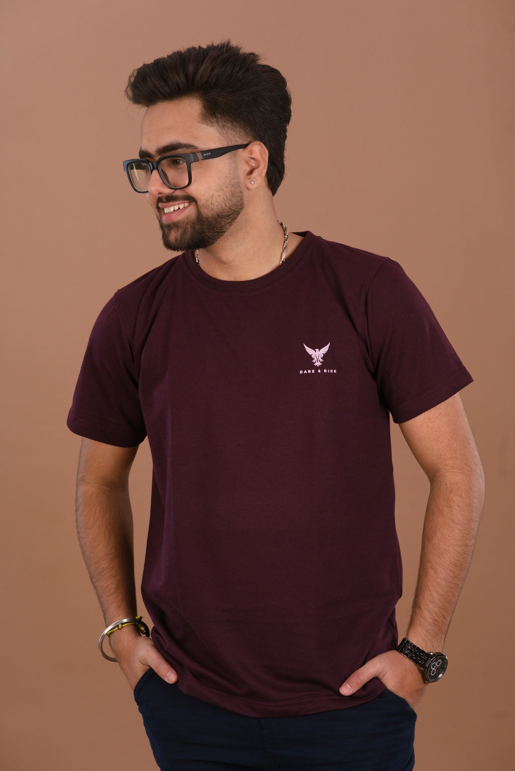 The Deep Wine regular fit tee is a sophisticated statement piece. Pair it with Navy Blue trousers (as seen in the photo) for a classic, high-contrast look. It also pairs exceptionally well with black tech-joggers for a modern, urban aesthetic.