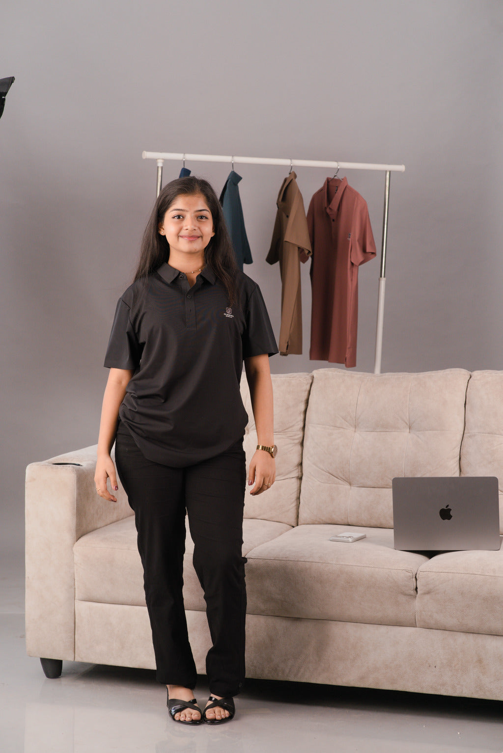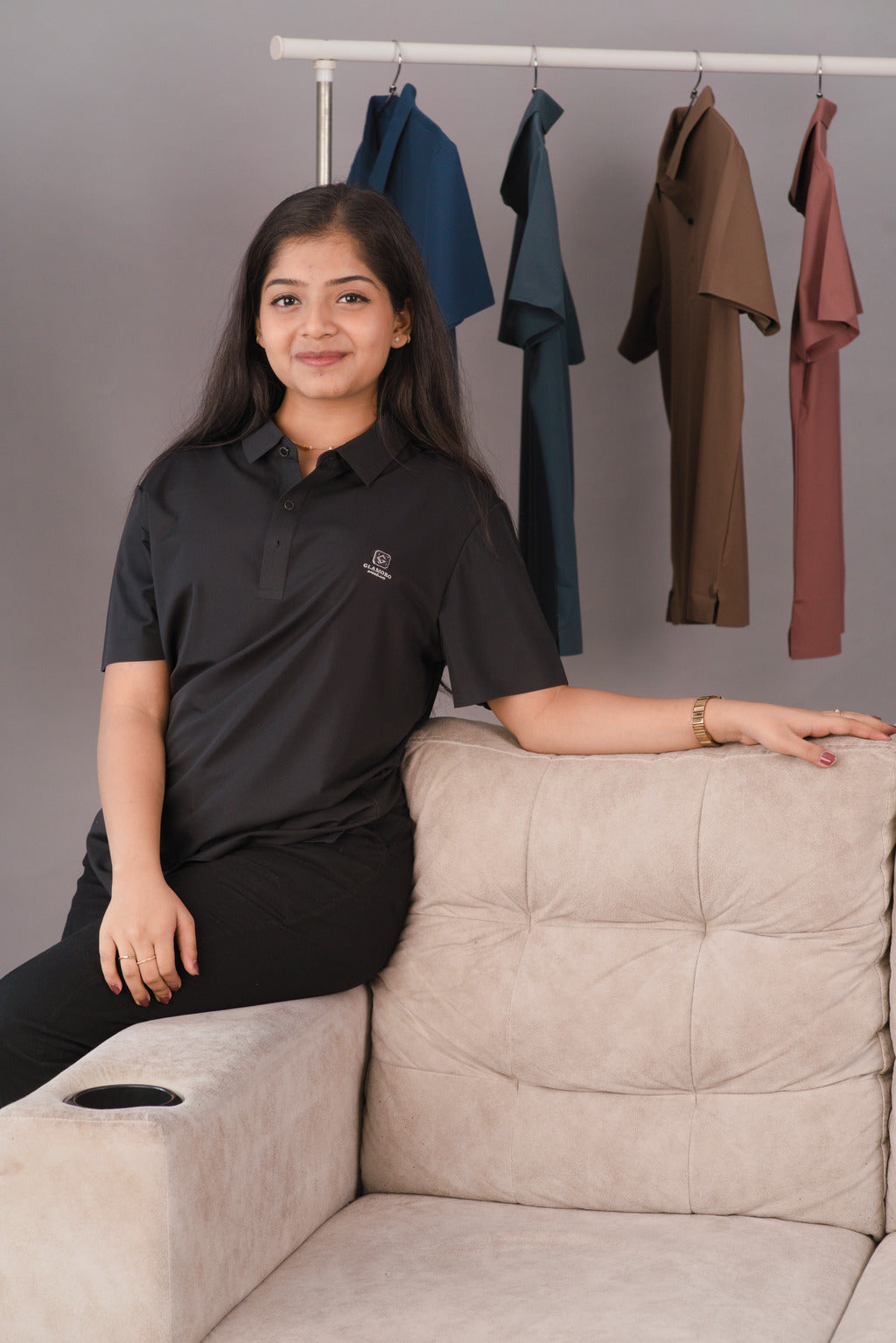 The Jet Black Tech Polo is a versatile powerhouse. Pair it with black trousers for a "triple black" executive look, or wear it with light-colored chinos for a high-contrast smart-casual vibe. Its matte finish makes it perfect for layering under a blazer without added bulk.