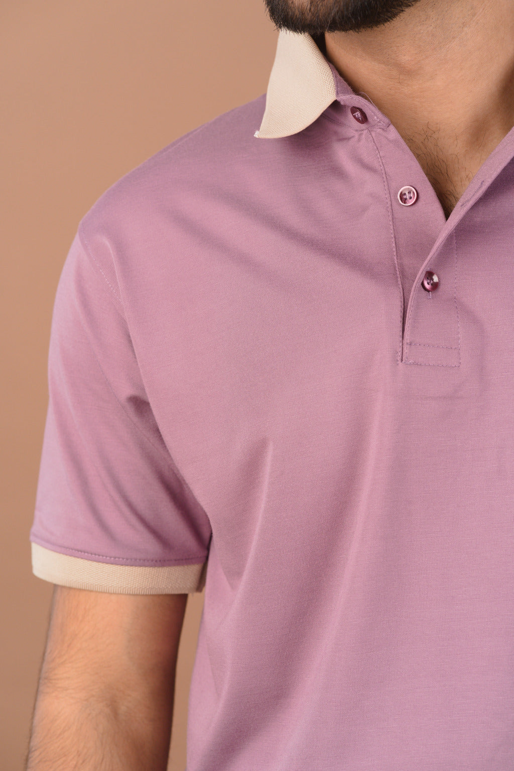 Designed for a versatile lifestyle, this polo features a contrasting Sand Beige collar and cuff detail that adds a refined, layered aesthetic. Whether you are heading to a weekend brunch or a casual office setting, the Lavender Frost Polo provides superior stretch and wrinkle resistance, ensuring you look polished and feel effortless from morning to night.