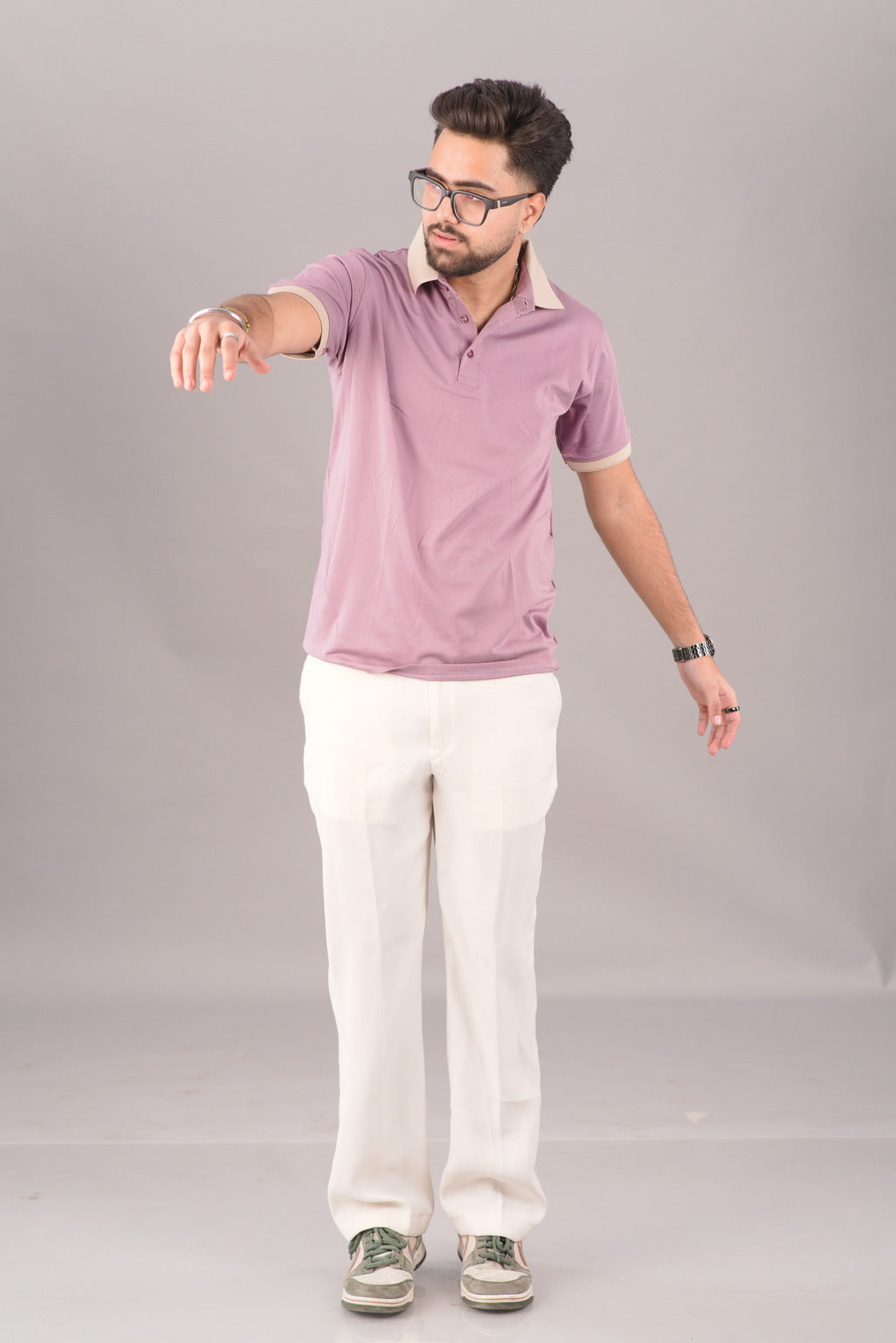 The Lavender Frost polo is designed for clean, tonal styling. Pair it with Sand Beige chinos (as seen in the collection) to match the collar tipping for a cohesive, high-end look. It also pairs perfectly with dark blue denim for a more relaxed, smart-casual vibe.