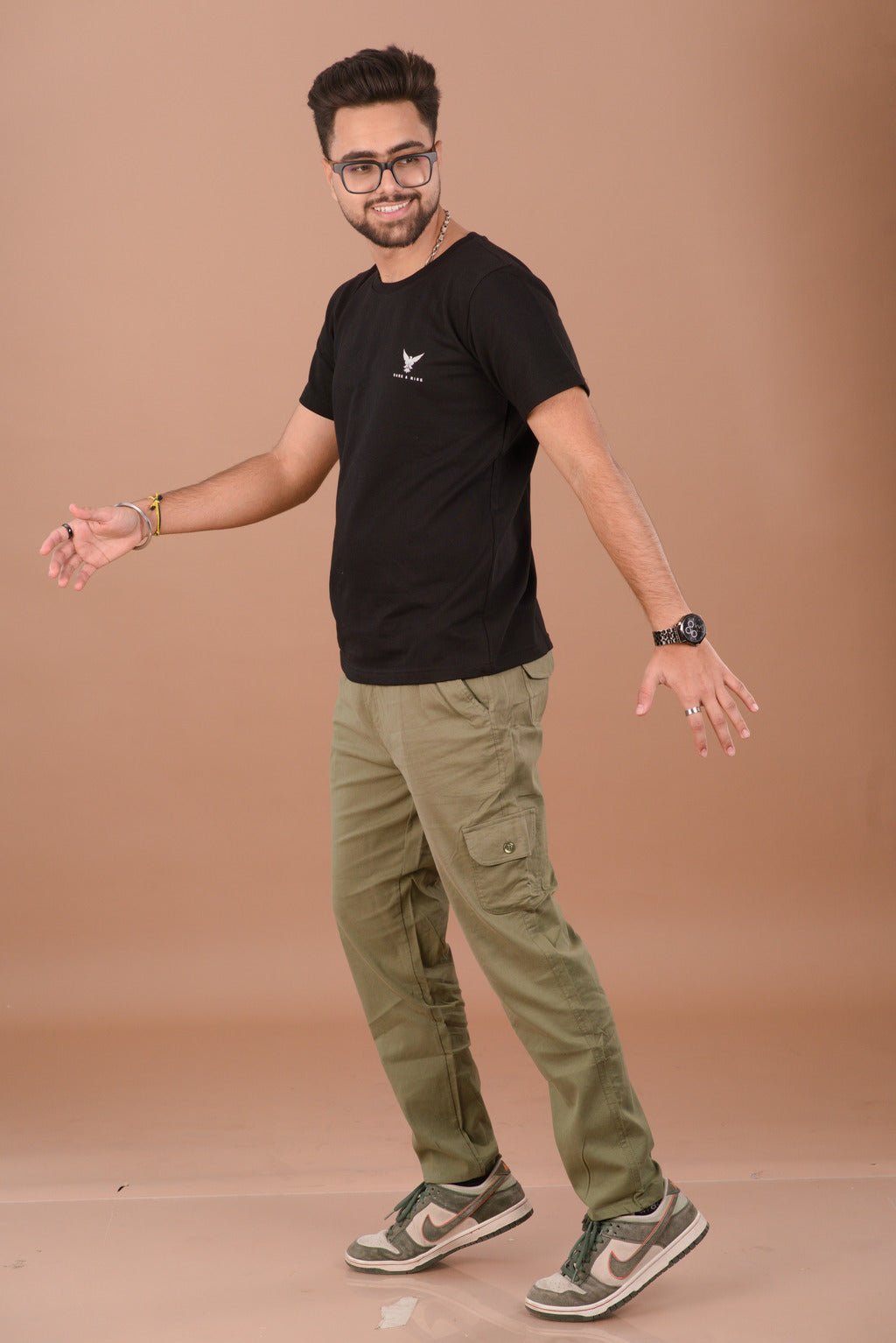 The Midnight Black regular fit tee is the ultimate versatile piece. Pair it with Olive Green cargo shorts (as seen in the photo) for a rugged, outdoor-inspired look. For a sharper urban vibe, style it with black tech-pants and white sneakers for a clean monochromatic finish.
