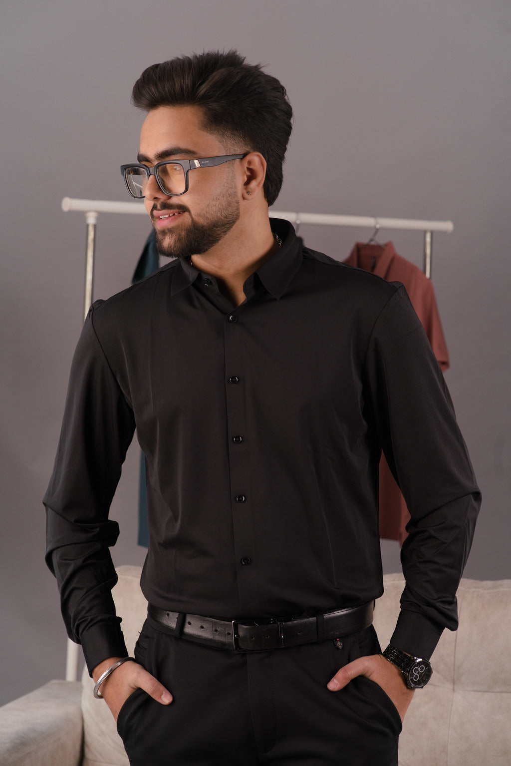 Master the art of understated power with the Midnight Black Men’s Smart Tech Shirt by Dare & Rise. This absolute black formal shirt represents the pinnacle of executive style, engineered using advanced stitch-less technology. By replacing traditional sewn seams with high-strength, precision-bonded construction, we have eliminated the bulk and friction of internal threads, resulting in a razor-sharp, aerodynamic silhouette that feels like a second skin.