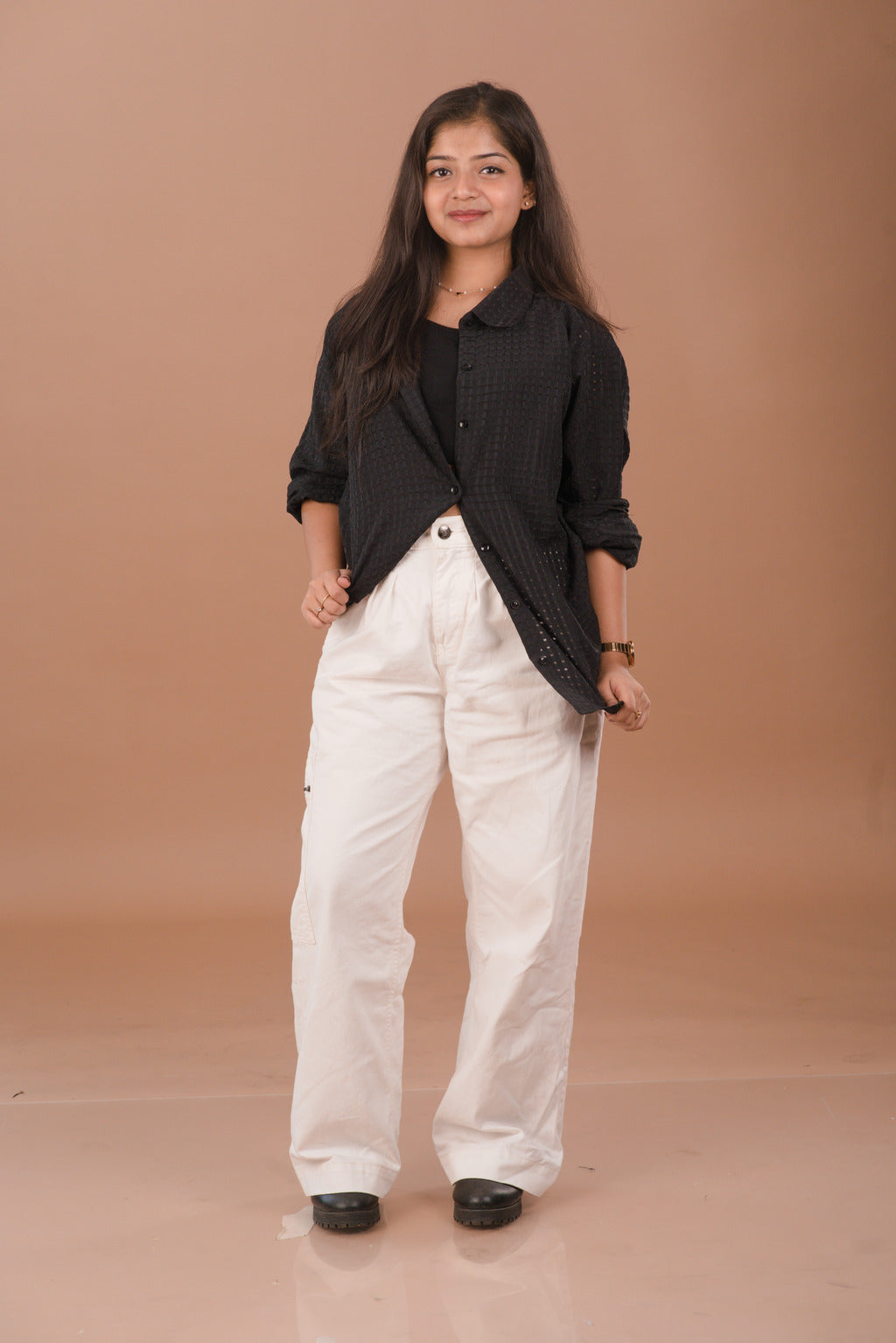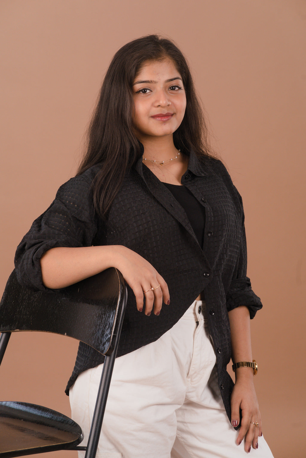 The Pitch Black Sheer Shirt is a styling powerhouse. Pair it with White high-waisted trousers (as seen in your collection) for a crisp, high-contrast look, or layer it over a black bodysuit and distressed denim for a bold, evening-ready aesthetic.
