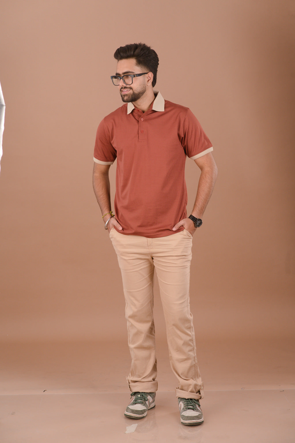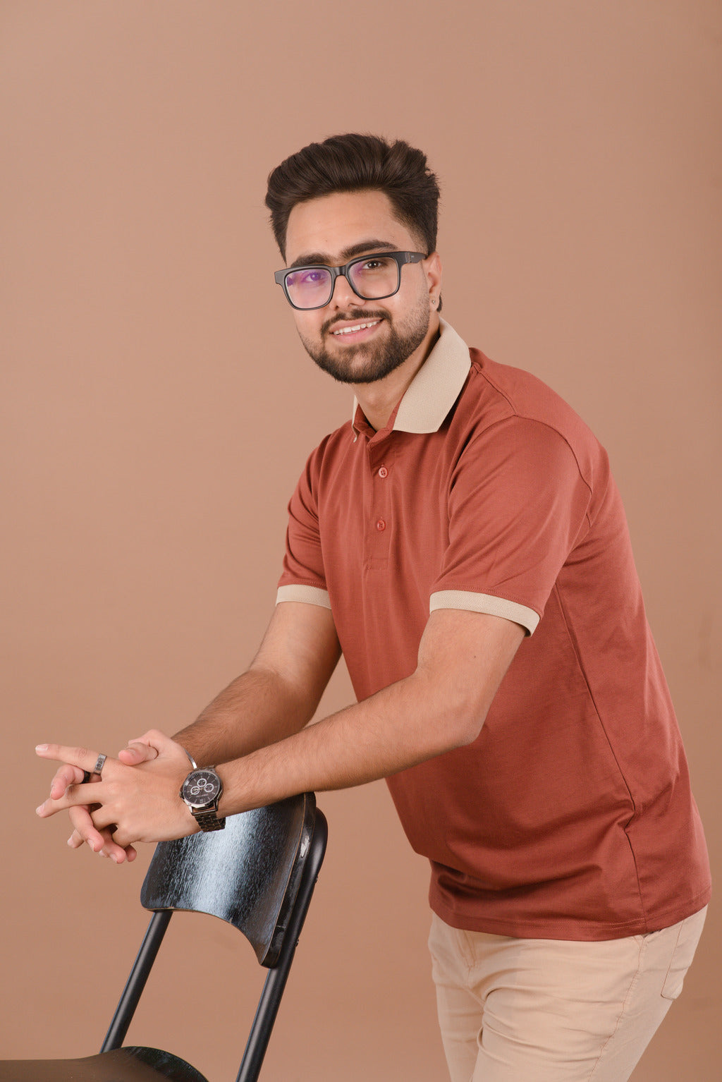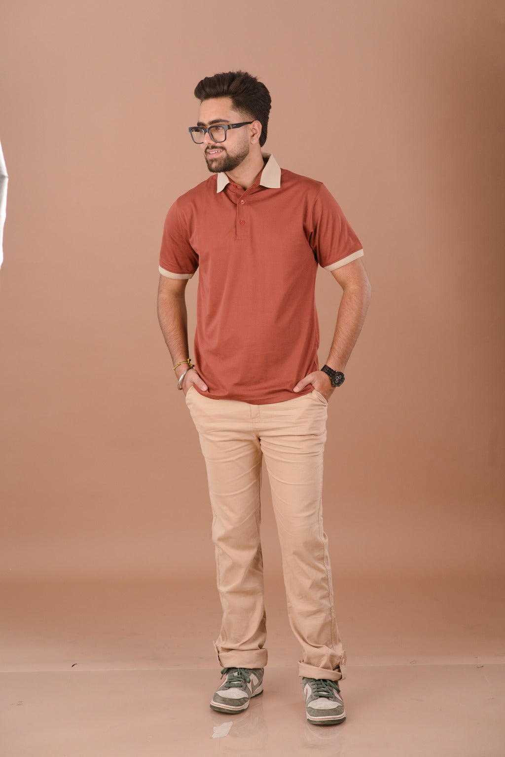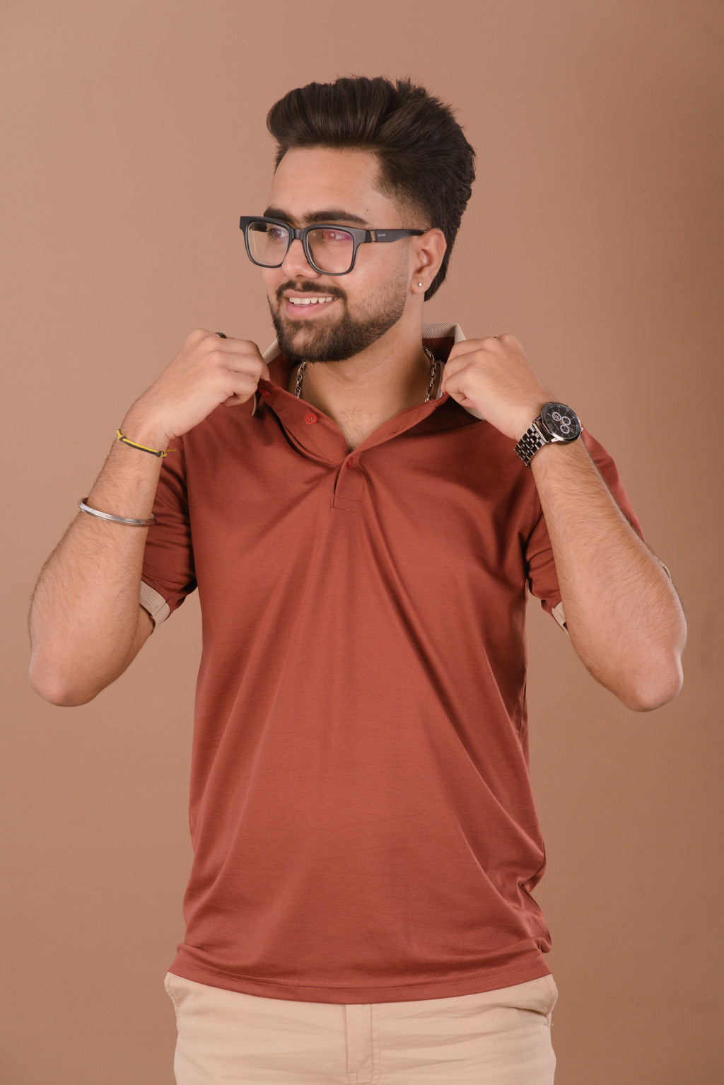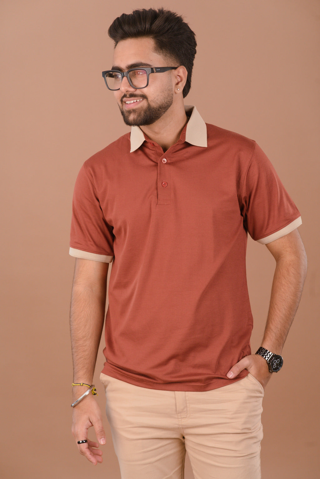 The Rust Ember polo is a versatile styling piece. Pair it with Khaki or Beige chinos (as seen in the collection) to highlight the contrast tipping. For a more rugged, urban look, style it with dark indigo denim and brown leather loafers.