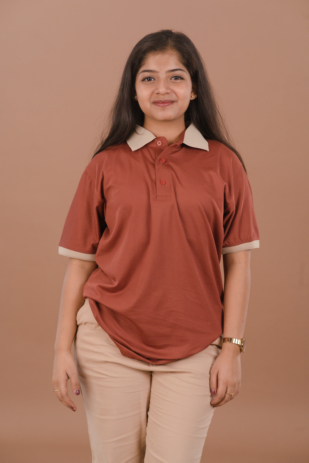 This warm hue pairs exceptionally well with Beige or Tan chinos for a cohesive, tonal look. For a sharper contrast, try wearing it with Dark Indigo denim or Deep Navy trousers to let the Terracotta color truly stand out.