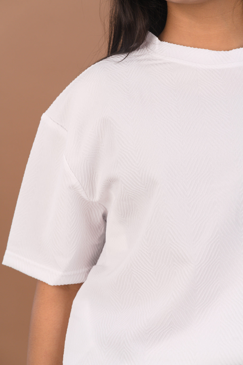 Keep your everyday style effortlessly classy with our White Jacquard Self-Textured Premium Women’s T-Shirt, designed for women who love comfort with a luxurious finish.