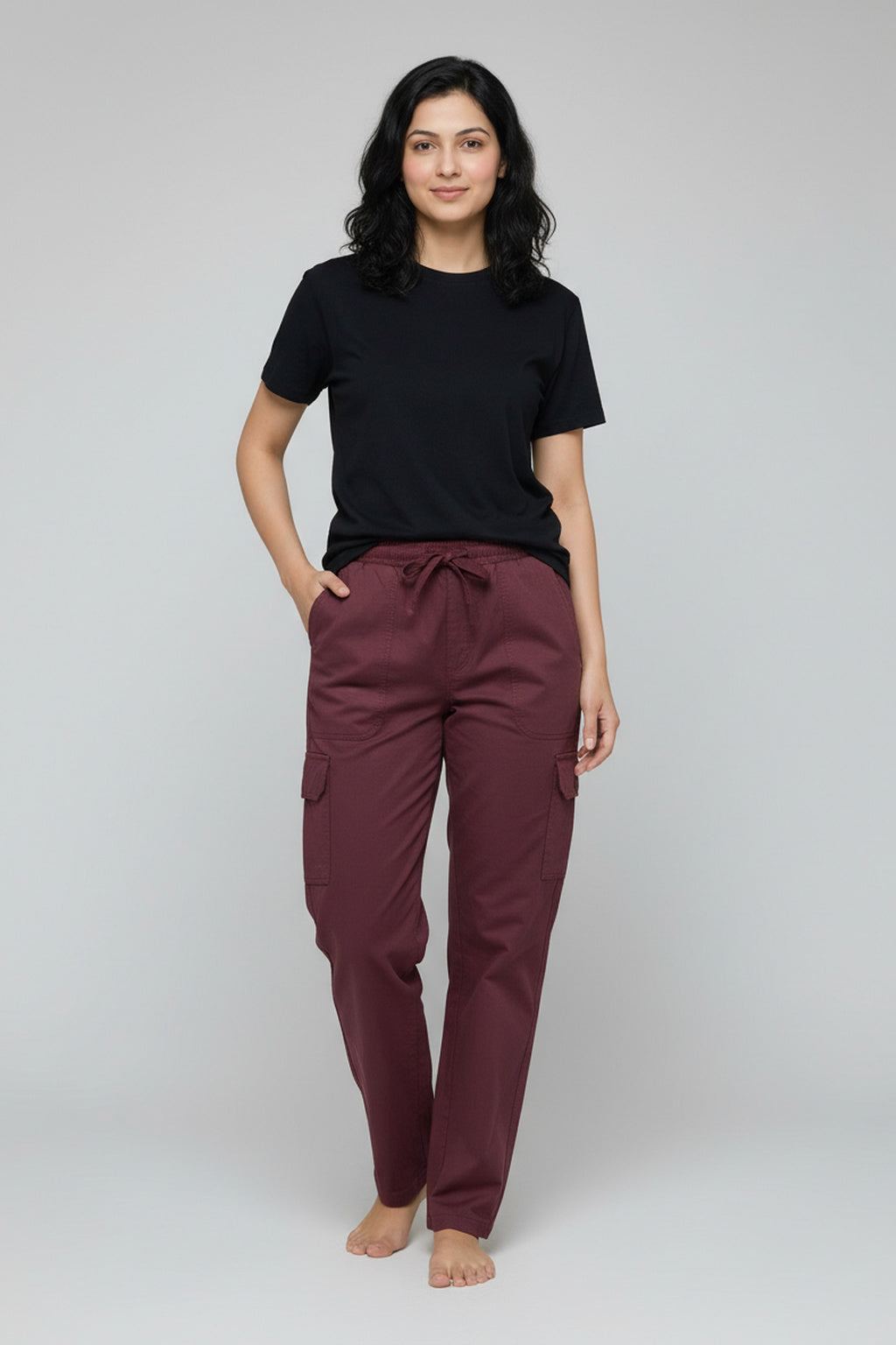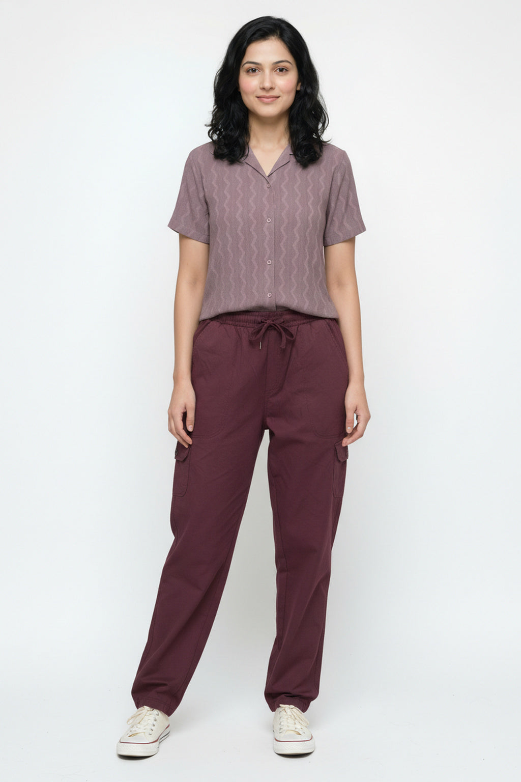 The Wine Maroon Women's Cargos create a powerful statement when paired with neutral tones. Try styling them with the Oatmeal Grid Organic Cotton Shirt for a sophisticated play on texture and color.