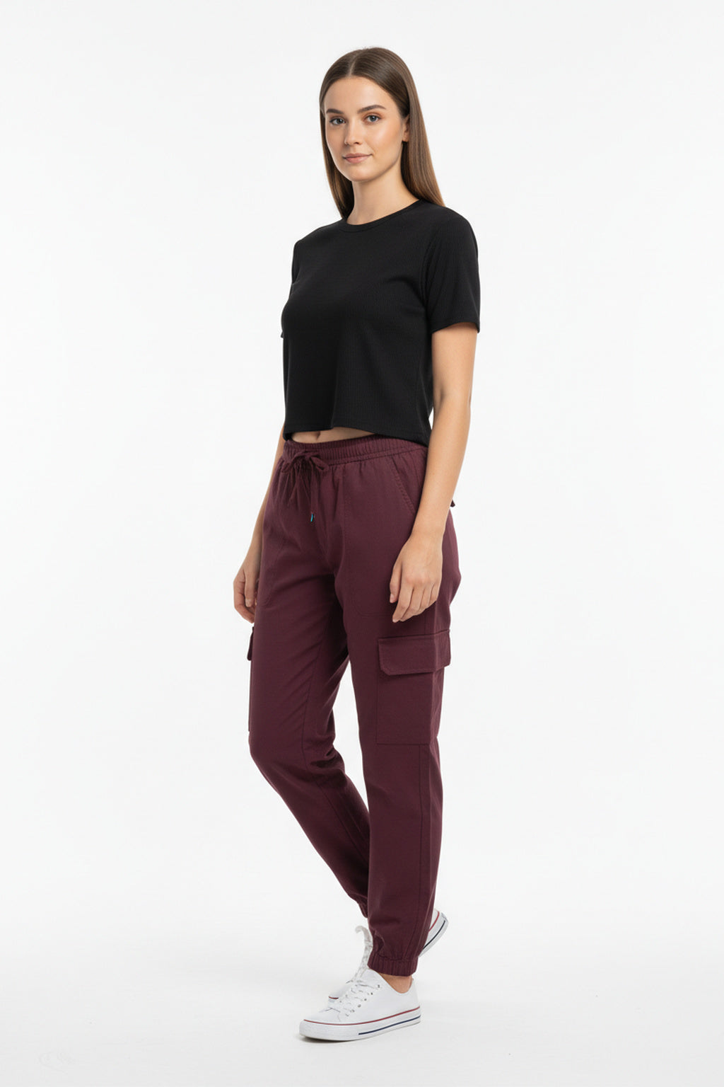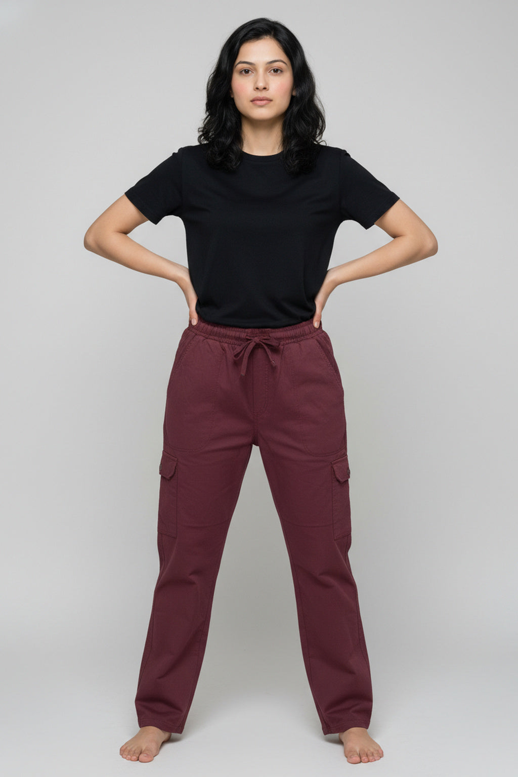 This variant features a classic utility build, including streamlined side-entry pockets and reinforced cargo flap pockets for a commanding streetwear aesthetic tailored for the female form. With a rich Wine Maroon finish and a refined tailored-cargo fit, these pants provide a structured, "Quiet Luxury" look that transitions effortlessly from active city exploration to high-end social settings.